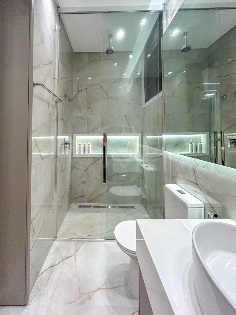 Na área íntima, a suíte master entrega conforto absoluto com closet sofisticado e banheiro com hidromassagem dupla, além de climatização completa em todos os ambientes.
